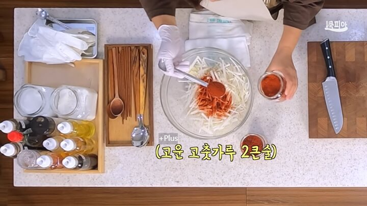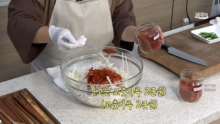 절임을 하지 않기 때문에 대신 밑간을 해 주어야 합니다. 고운 고춧가루 2큰술, 굵은 고춧가루 2큰술을 넣어줍니다. 고춧가루를 고운 것과 굵은 것 두 가지를 모두 쓰는 이유는 고운 것은 무의 수분을 너무 빼주기 때문에 무가 늘어지게 되고 굵은 것만 쓰면 수분을 많이 빼지 않아 뻣뻣해집니다. 그래서 두 가지를 함께 섞어서 무가 아삭하도록 해 줍니다.