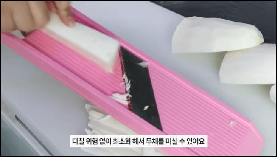 한 조각씩 잡고 채칼을 이용해 채 썰어주는데, 쭉쭉 힘있게 밀어주어야 고르게 모양이 나옵니다. 살짝 밀다말다하면 모양이 고르지 못하고 중간에 끊어지기도 하니 박력있게 쭉쭉 밀어줍니다.
