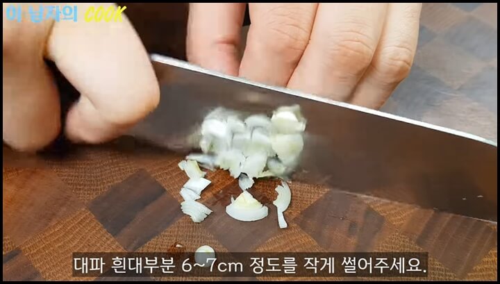 미나리를 담가두는 동안 파를 썰어줍니다. 흰 부분만 6~7cm 정도 잘라서 잘게 썰어줍니다.