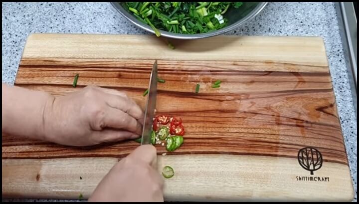 데친 방풍나물은 먹기 좋은 크기로 적당하게 썰어줍니다. 쪽파 6개도 적당하게 쫑쫑 썰어주고, 청양고추, 홍고추조 송송 썰어줍니다. 청양고추를 넣어주면 방풍나물 초무침의 달달한 맛이 살아나며 더 맛있습니다.