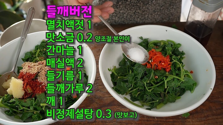 들깨버전 방풍나물 무침에는 멸치액젓 1숟갈을 넣고, 맛소금 0.2숟갈 정도 넣어주는데 소금 간을 하면 더 맛있다고 해요. 소금 양은 입맛에 맞춰 간을 맞춰 조절하세요.