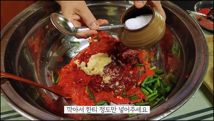 간을 본 후 싱거우면 소금을 반 작은 술 정도 더 추가해서 간을 맞춥니다. 그러면 배추겉절이 완성입니다.