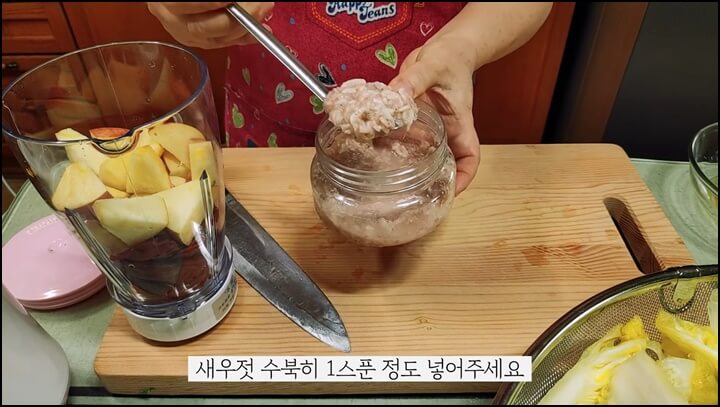 생강 1톨, 사과 반쪽, 새우젓 수북하게 1스푼, 물 반 컵 정도 넣고 믹서에 갈아줍니다.