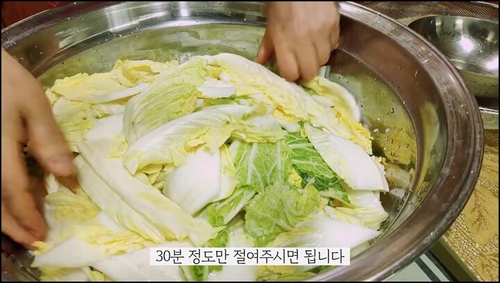 배추겉절이는 오래 절일 필요없이 30분 정도만 절이면 됩니다. 아삭거리는 맛이 있어야 하기 때문에 오래 절이지 않아도 됩니다.