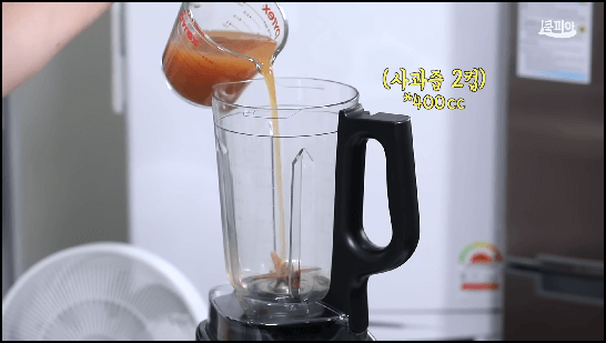 1) 믹서기에 사과즙 400cc를 넣어줍니다. 시판하는 사과즙 넣으시면 됩니다.