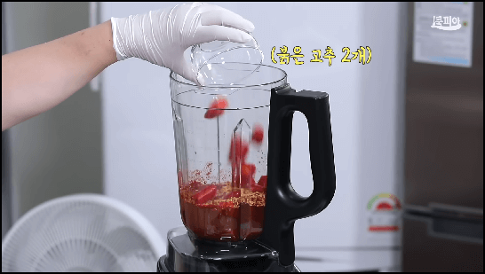 2) 고춧가루 1컵, 고추씨 3큰술을 넣고, 붉은 고추 2개도 같이 넣어줍니다.