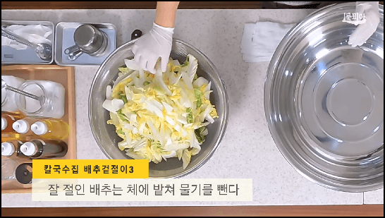 4) 잘 절인 배추는 체에 밭쳐 물기를 빼 줍니다.