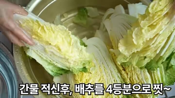 간물을 적신 후에 배추를 4등분으로 찢어줍니다. 간물을 적셔서 찢으면 잘 찢어집니다.