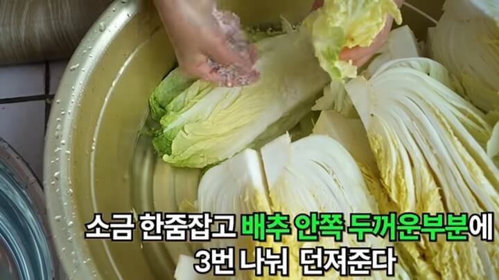 배추를 4등분 한 다음 천일염 한 줌을 쥐고 배추 안쪽 두꺼운 부분에 3번 나누어서 던져 넣어 뿌려줍니다. 맨 위에 뿌린 소금이 잘 녹아들어 가도록 물을 살짝 뿌려줍니다.