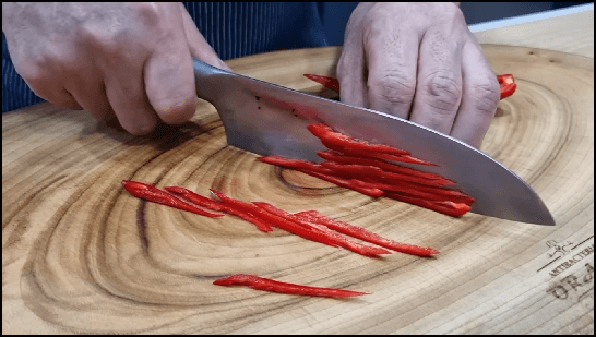 무 600g을 준비해서 반으로 가른 다음 4~5mm 간격으로 썰어줍니다. 무가 들어가면 국물이 시원해 집니다. 홍고추 1개는 고명으로 사용합니다. 반으로 갈라 씨를 제거한 후 가늘게 채 썰어줍니다.