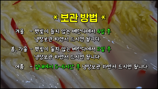 완성된 백김치는 겨울에는 햇빛이 들지 않는 베란다에서 4일 후에 냉장보관하고, 봄 가을에는 햇빛이 들지 않는 베란다에서 2일 후에 냉장보관, 여름에서 실내에서 5~6시간 후에 냉장보관하면 됩니다.