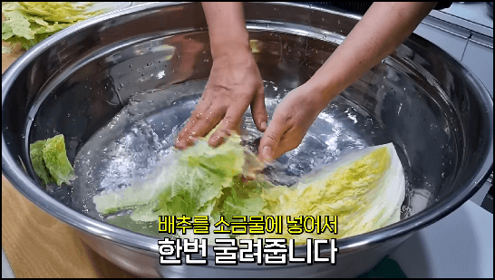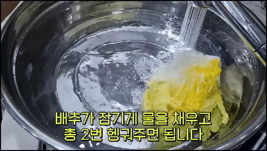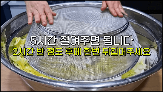 배추 절이는 시간은 총 5시간입니다. 2시간 반 정도 후에 한번 뒤집어 주면 되고, 시간이 바쁜 분들은 절임물을 약간 미지근한 물로 하면 시간을 단축할 수 있습니다.