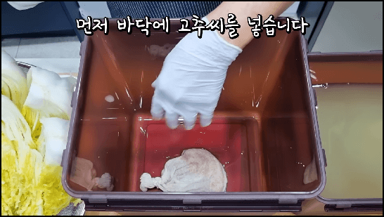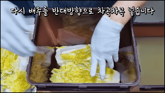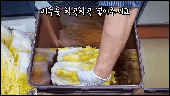 배 즙에 담가두었던 고추씨 주머니를 바닥에 먼저 깔아줍니다. 그런 다음 배추를 차곡차곡 넣어주는 한층 깔고 무 썬 것을 몇개 올려준 다음, 다시 반대방향으로 배추를 깔아줍니다. 다시 무를 넣고 이렇게 층층이 배추와 무를 넣어서 통에 담아줍니다.
