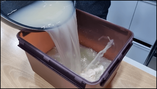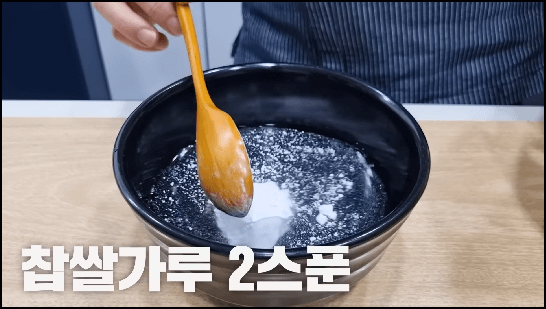 다시마 물을 끓이고 있는 동안 물 2컵에 찹쌀가루 2스푼을 넣어 잘 풀어서 준비합니다. 백김치에는 찹쌀가루를 너무 많이 넣으면 국물이 탁해지니 조금만 넣으면 됩니다. 찹쌀물을 미리 만들어 놓고 다시마가 5~6분 끓도록 기다립니다.