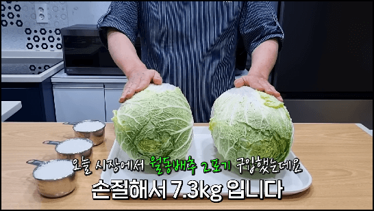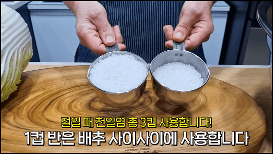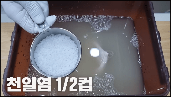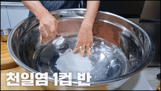 먼저 배추를 절여줍니다. 물 5리터에 천일염 1컵 반을 넣어서 잘 녹여줍니다. 남은 천일염 1컵 반은 나중에 배추에 뿌려 줄 것이니 잠시 옆에 두도록 합니다.