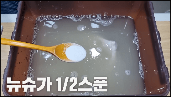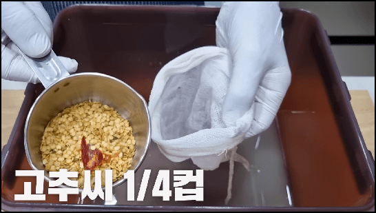 삼베주머니에 고추씨 1/4컵을 넣어서 풀리지 않도록 잘 묶어준 후 배 즙에 같이 담가줍니다. 그런 다음 찹쌀풀 끓인 것을 한번 저은 후 모두 부어줍니다. 생수 3리터를 넣고, 천일염 반 컵을 넣어줍니다. 군내 방지를 위해 소주 반 컵도 넣어주고, 멸치액젓 1/3컵, 뉴슈가 1/2스푼을 넣고 잘 저어서 소금과 뉴슈가 잘 녹도록 합니다. 그런 다음 간을 봐서 입맛에 맞게 간을 맞춰줍니다. 약간 간간하게 하면 되는데 취향껏 맞추시면 됩니다.