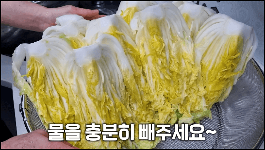 절인지 5시간이 지난 배추가 소금에 잘 절여졌습니다. 물에 담가 배추 사이사이의 소금기가 잘 빠지도록 씻어줍니다. 찬물에 2번 정도 씻어주면 됩니다. 그런 다음 소쿠리에 담아서 물기를 충분히 빼 줍니다.