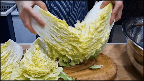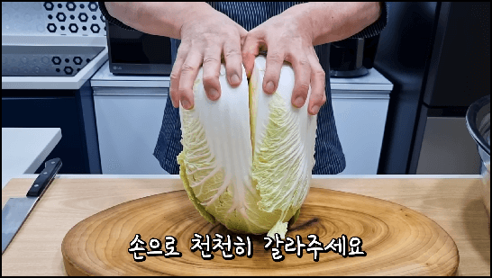 배추의 겉잎을 떼고 손질한 후 배추를 반으로 잘라주는데, 칼집을 반 정도만 넣은 후 손으로 갈라줍니다. 배추 잎이 겹겹이 되어 있어 칼로 자르게 되면 자잘하게 나오는 것들이 많으니 손으로 갈라주는 것이 좋습니다. 반으로 자른 후 다시 반으로 갈라 총 4등분으로 잘라줍니다.
