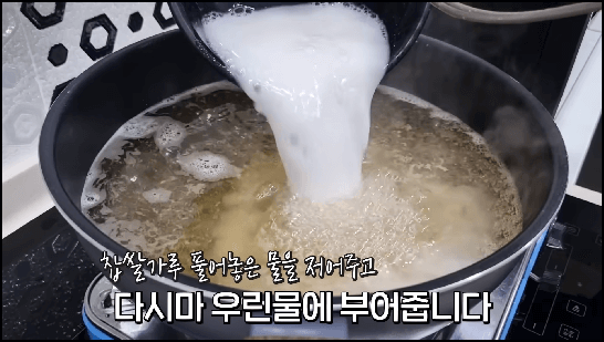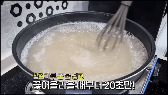 다시마 물 끓인 지 5~6분이 되면 다시마는 건져내고, 찹쌀가루 풀어놓은 물을 한번 저어서 부어줍니다. 이대로 찹쌀풀을 끓여주는 것입니다. 끓어오르면 20초 정도만 저어주고 불을 끄면 됩니다. 찹쌀풀은 충분히 식혀서 사용합니다.