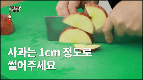 준비한 과일은 깨끗이 씻어서 준비하고, 껍질째 잘라서 냄비에 넣어줍니다. 두께는 1cm 정도의 두께로 잘라주면 되고, 백종원님 뱅쇼 만들기에서는 사과, 오렌지, 레몬을 사용했으니 참고하세요. 배나 귤도 넣어주면 좋습니다.