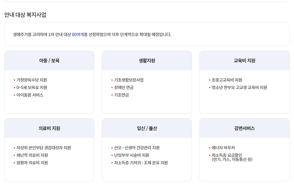 복지 멤버십 제도에 가입하게 되면 생애주기를 고려하여 선정된 80여개의 지원 사업을 안내받을 수 있으며, 이후 단계적으로 더 확대되어 더 많은 지원 사업을 안내받을 수 있게 됩니다.
