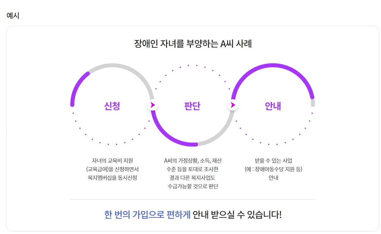 A씨는 자녀의 교육비 지원을 신청하면서 복지 멤버십을 동시에 신청하였는데요, A 씨의 가정상황, 소득, 재산 수준 등 공적자료를 기반으로 시스템을 통해 자동 판정을 한 결과 다른 복지사업도 수급이 가능할 것으로 판단되었습니다. 따라서 A 씨는 신청하려던 교육비 지원 외에 장애아동수당 지원 등을 받을 수 있었습니다.