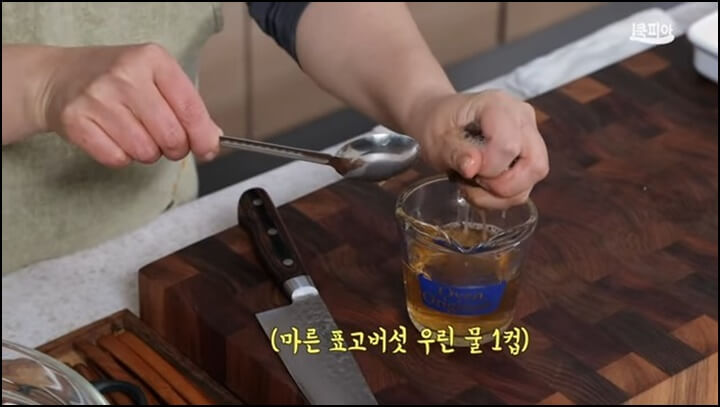 멸치액젓 2큰술, 참치액 1큰술, 다진 마늘 1큰술, 다진 생강 1/4작은술을 넣고 여기에 마른 표고버섯 우린 물 1컵을 넣어줍니다.