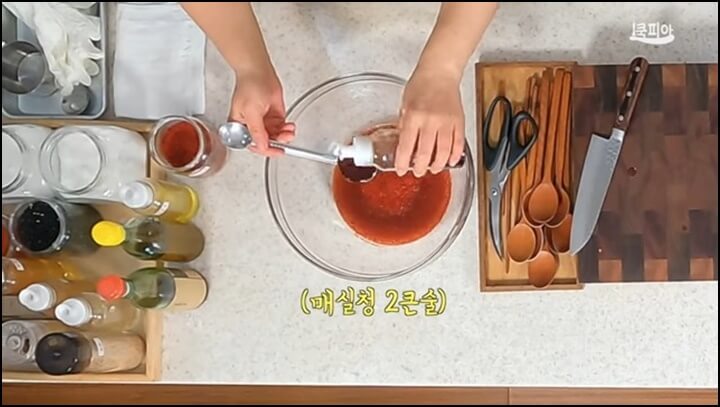 여기에 고춧가루 6큰술, 매실청 2큰술을 넣고 잘 섞어줍니다. 고춧가루 색이 잘 풀렸다면 간을 보고 소금 1/2큰술을 넣어 간을 맞춰줍니다.
