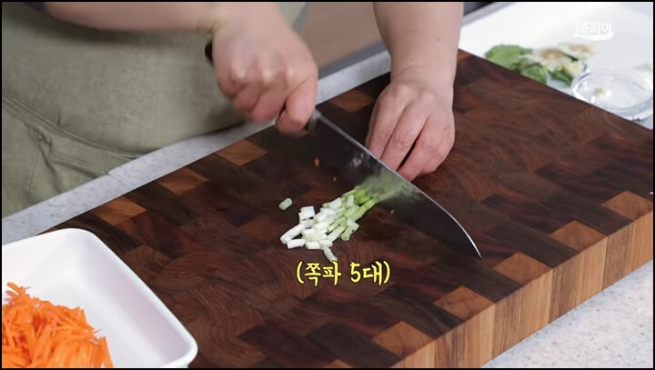 봄동 겉절이에 당근을 넣어주면 색도 이쁘고 갓 무쳐서 먹는 맛을 더해주니 더욱 좋습니다. 당근은 얇고 가늘게 채 썰어주고, 쪽파는 1cm 길이로 잘라줍니다.
