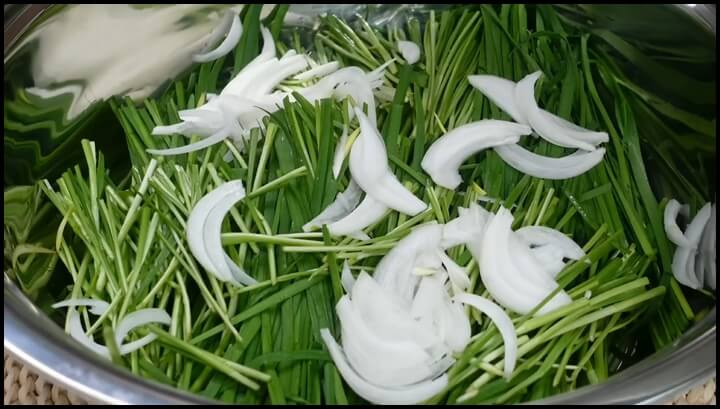 1) 큰 그릇에 부추와 양파를 모두 넣고 골고루 섞어줍니다.