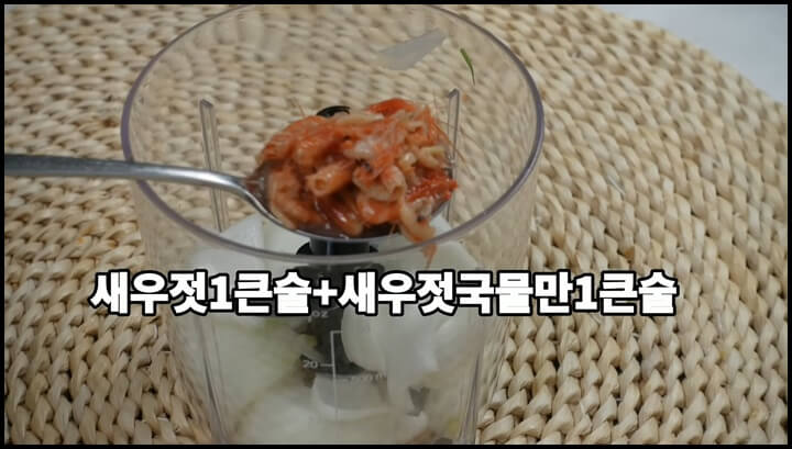 2) 새우젓 2큰술을 넣어줍니다. 1큰술은 건더기와 함께 넣고, 나머지 1큰술은 국물만 넣어줍니다.