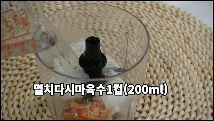 4) 멸치다시마 육수 1컵(200ml)를 넣고 곱게 갈아줍니다. 멸치다시마 육수는 감칠맛을 더해줍니다.