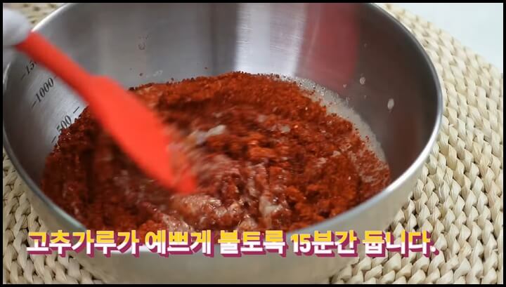 5) 고춧가루가 고운 빛깔로 잘 붇도록 15분 정도 그대로 둡니다.