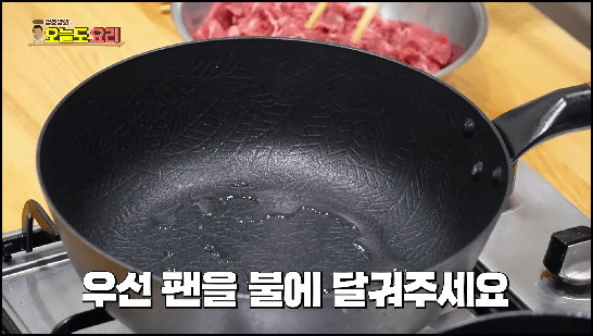 팬에 기름을 둘러서 달궈줍니다. 그런 다음 소고기를 넣고 살짝 구워줍니다. 양념에 재지 않고 이렇게 고기를 초벌로 구워주면 고기 겉면이 시어링 되면서 풍미가 더 좋아지고 고기 맛을 더 맛있게 즐길 수 있습니다.