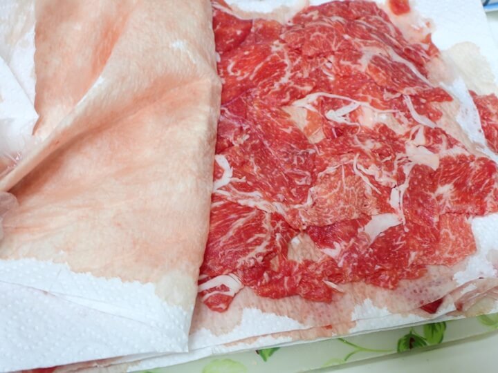 불고기 양념 황금레시피로 양념을 만들기 전에 먼저 소고기의 핏물을 빼 주어요. 키친 타월에 소고기를 펼쳐 놓고 다시 키친 타올로 덮어서 핏물을 빼 주어요. 이대로 겹쳐 놓고 핏물이 빠지는 동안 불고기 양념을 만들어요.