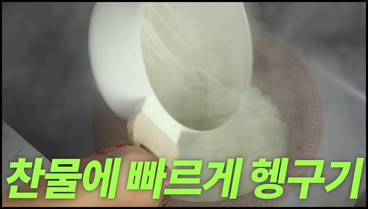 다 삶아진 면을 찬물에 빠르게 헹궈줍니다. 삶은 면을 찬물에 최대한 빠르게 헹궈주는 것이 중요한데요, 열을 최대한 빨리 식혀주는 것이 면을 더 탱글탱글하게 먹을 수 있습니다.