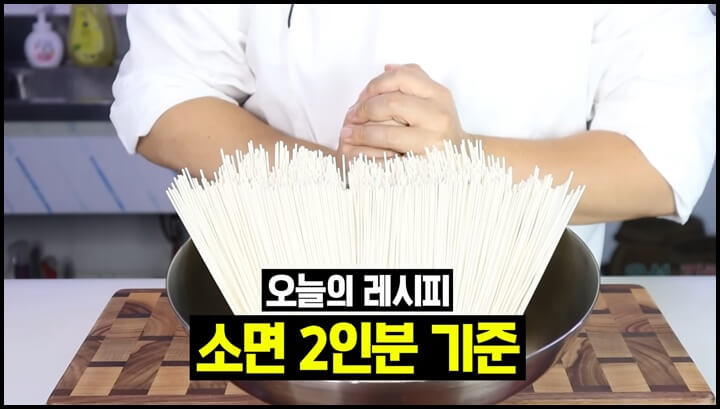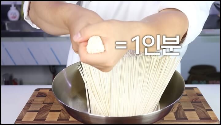 소면은 손가락으로 감싸쥐었을 때 500원 동전 크기 정도가 1인분의 양입니다. 2인분을 준비합니다.