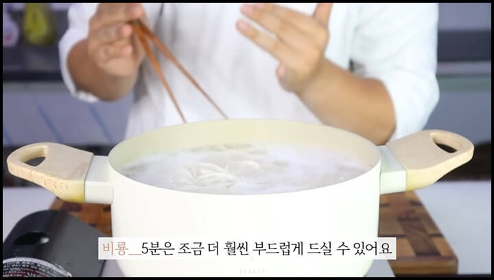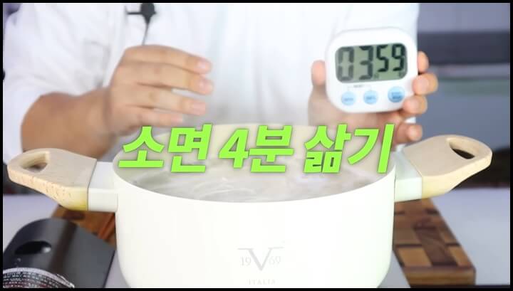 이대로 소면을 4분간 삶아줍니다. 4분을 삶으면 약간 식감있게, 5분을 삶으면 좀 더 부드럽게 먹을 수 있습니다.