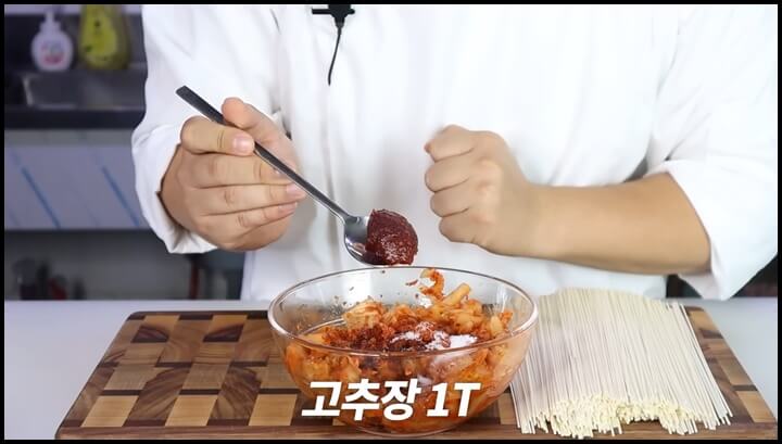 여기에 고추장 1큰술을 넣어줍니다. 고추장이 너무 많이 들어가면 텁텁하기 때문에 딱 1큰술만 넣어줍니다.