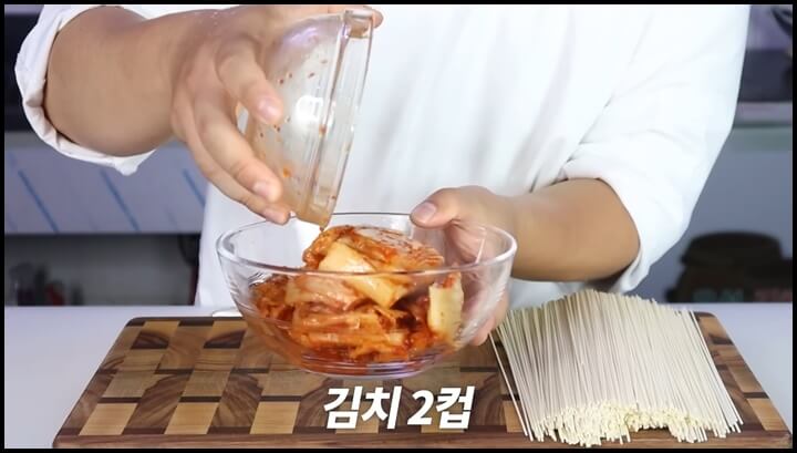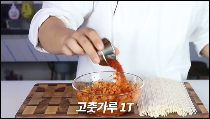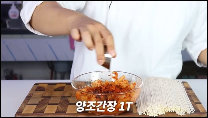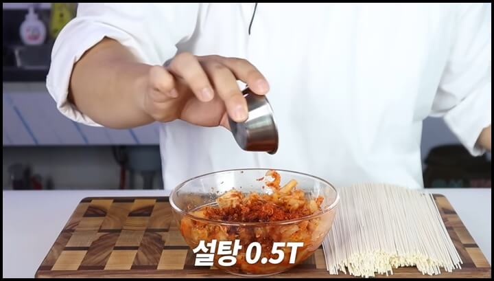 설탕 반큰술을 넣어주는데, 설탕을 넣으면 김치의 신맛을 살짝 잡아주고, 군내도 잡아주기 때문에 꼭 넣어주는 것이 좋습니다.