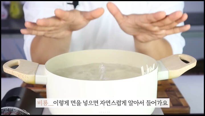 면이 보글보글 끓어오르면 찬물을 넣어서 식혀주고 다시 끓어오를 때까지 끓입니다. 이 과정을 2~3번 반복하면 면이 수축 이완하면서 더 쫄깃쫄깃해지고 탱글탱글해집니다.