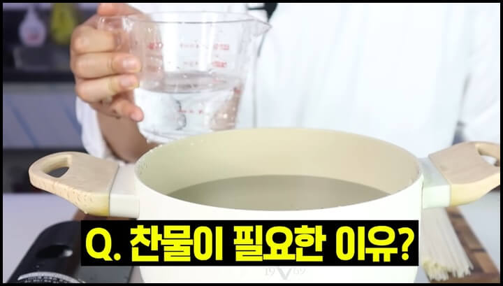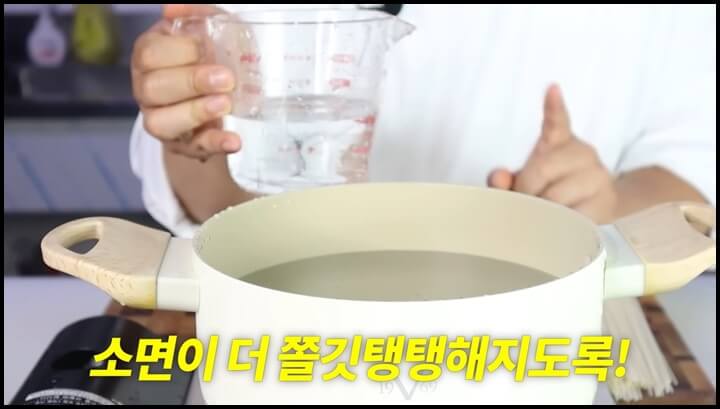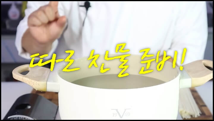 이제 소면을 삶아줄텐데요, 냄비에 물을 충분히 넣고 끓여줍니다. 그리고 찬물을 따로 조금 준비합니다. 찬물이 필요한 이유는 면이 삶아지는 과정에서 수축하고 이완하는 과정을 통해 더 쫄깃하고 탱탱해지도록 하기 위함입니다.