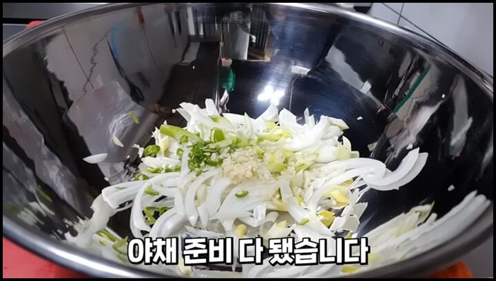 1) 양파 반개는 가늘게 채 썰어줍니다.