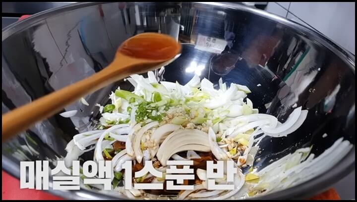 3) 매실액 1스푼 반을 넣습니다. 설탕 대신 매실액을 넣으면 훨씬 맛있습니다.