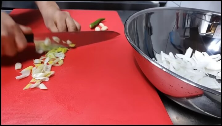 2) 대파는 길게 반으로 갈라 잘게 어슷 썰어줍니다.