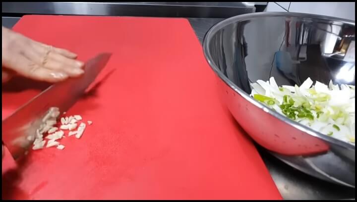 4) 마늘은 칼등으로 눌러 준 다음 잘게 다져줍니다.
