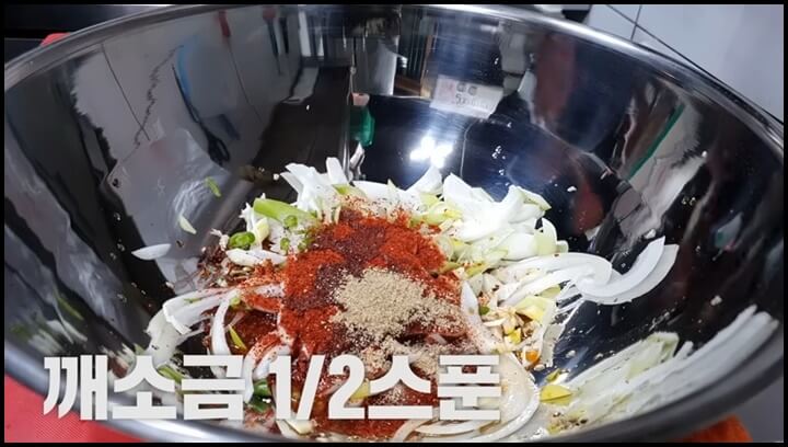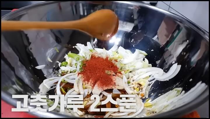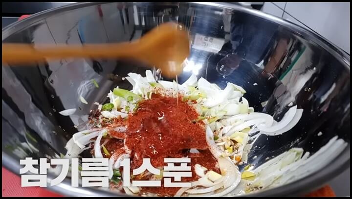 4) 고춧가루 2스푼, 참기름 1스푼을 넣고,