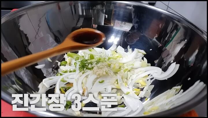 1) 야채 담아둔 그릇에 바로 양념을 합니다. 진간장 3스푼을 넣고,