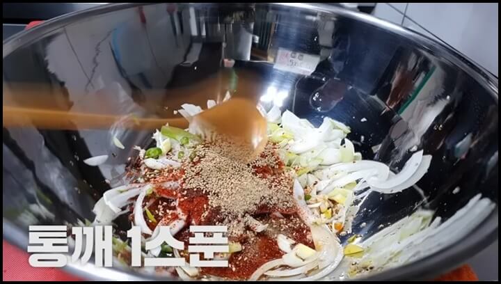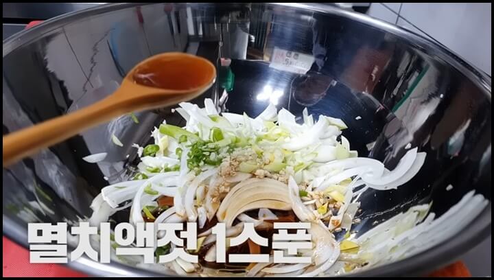 2) 멸치액젓 1스푼을 넣습니다. 멸치액젓을 넣으면 감칠맛이 돌아 맛있습니다.