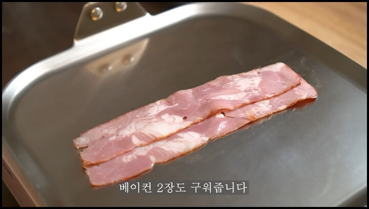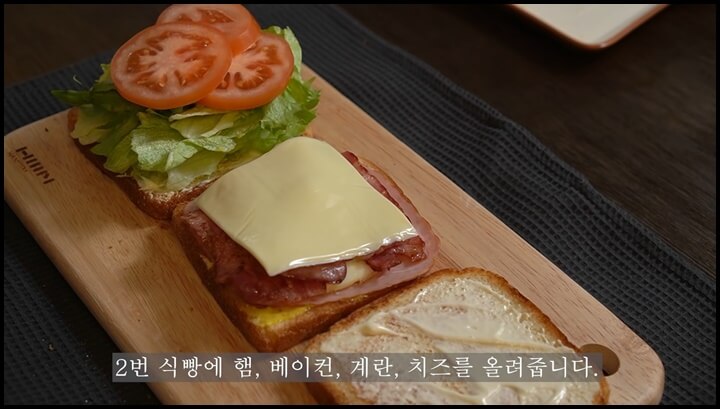 10. 2번 식빵에는 햄, 계란, 베이컨, 치즈 순으로 올려줍니다.